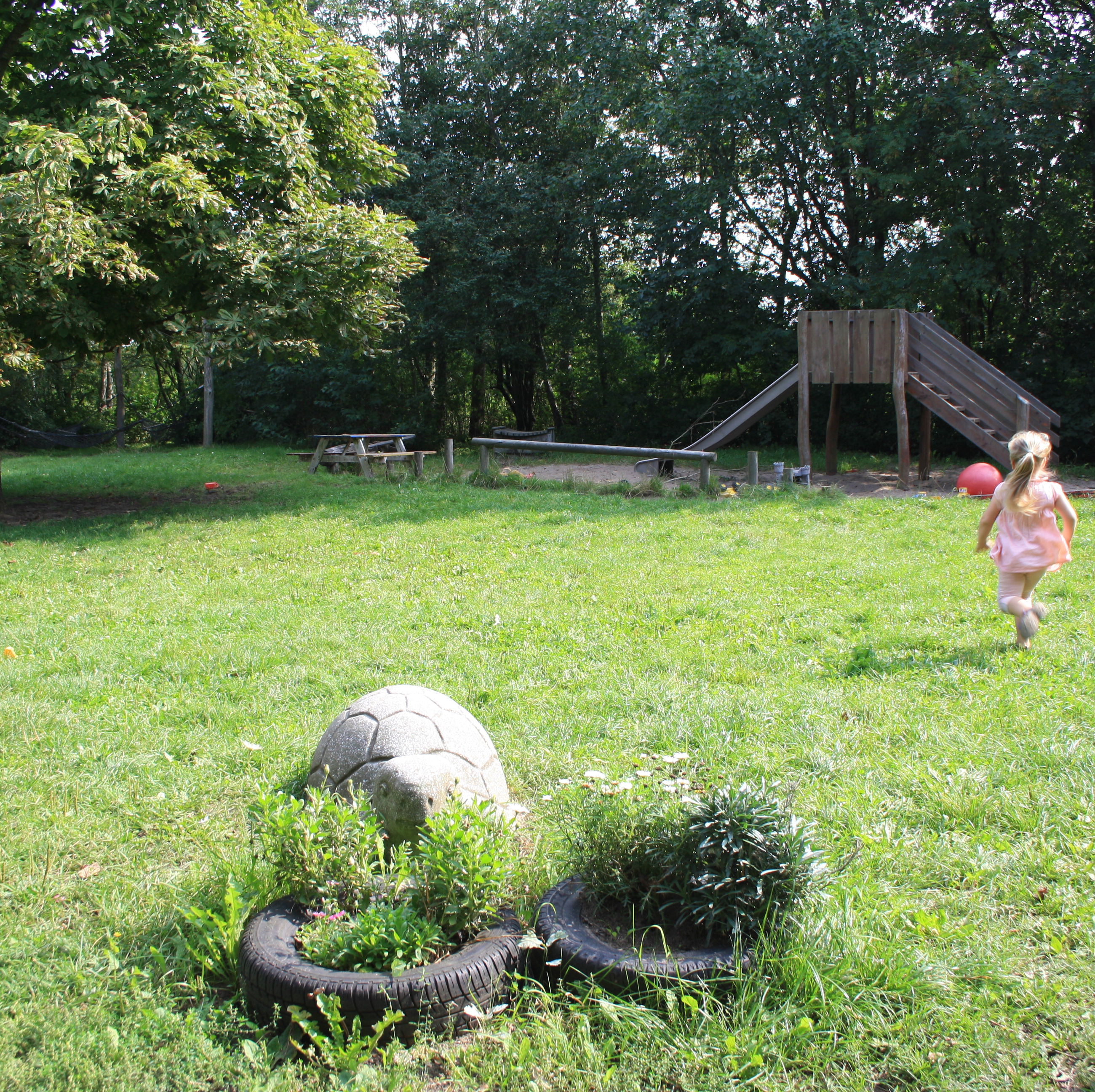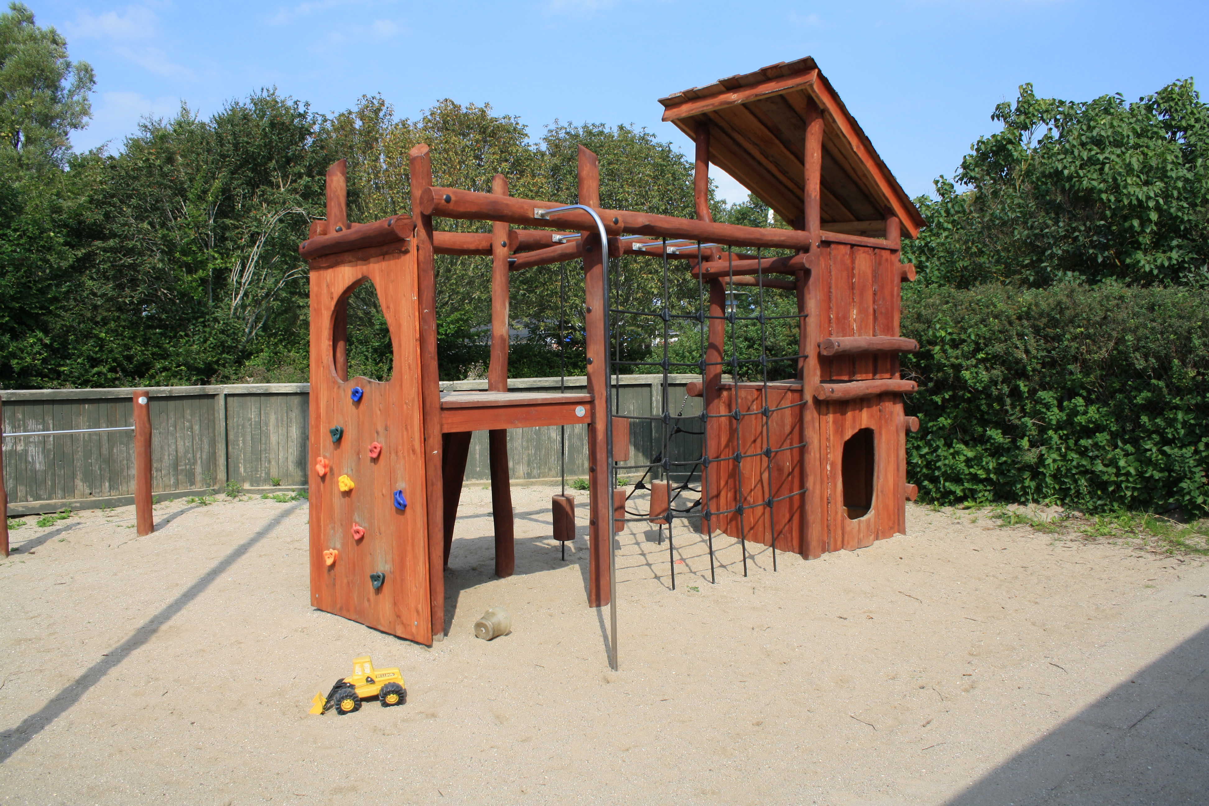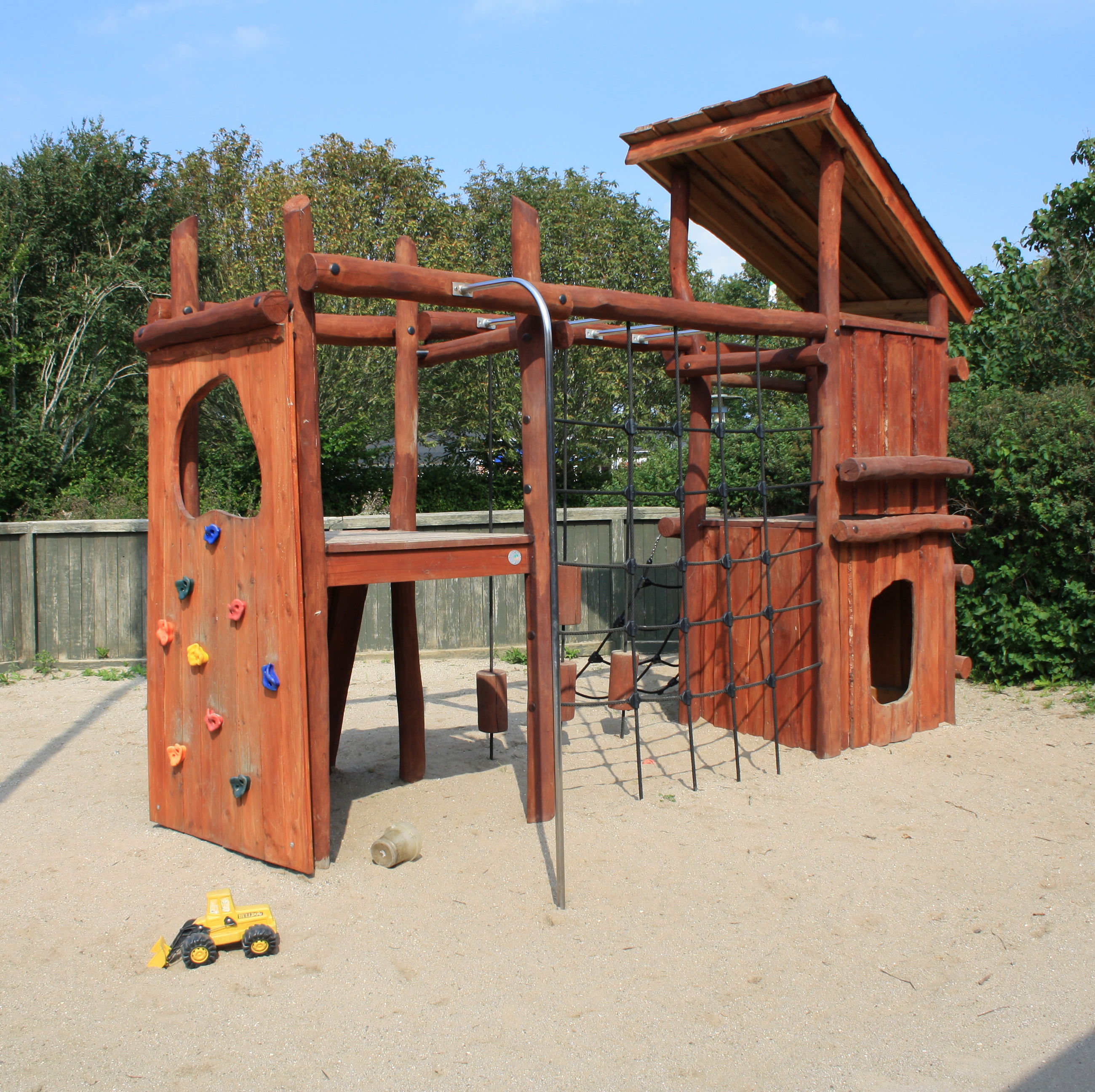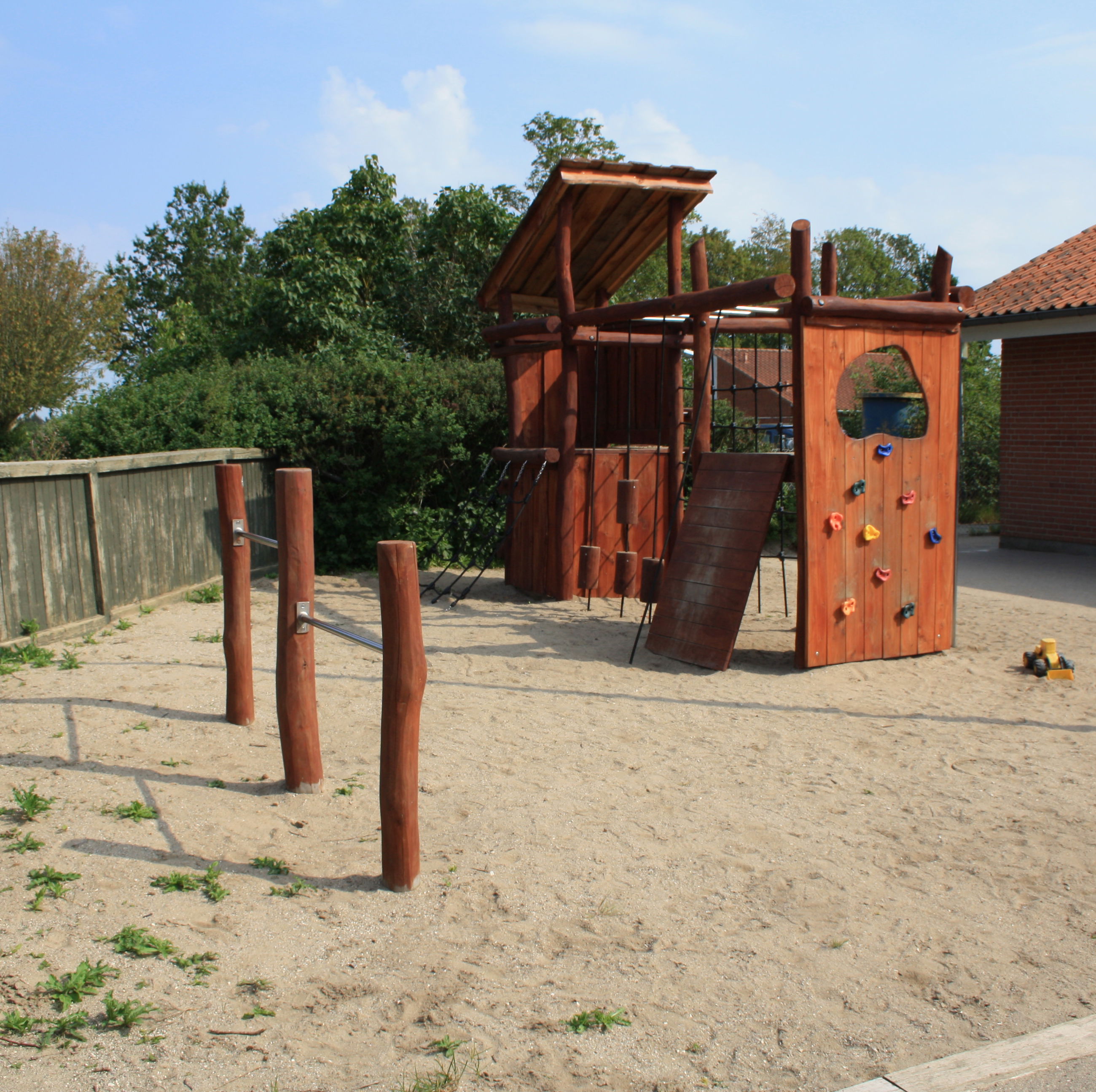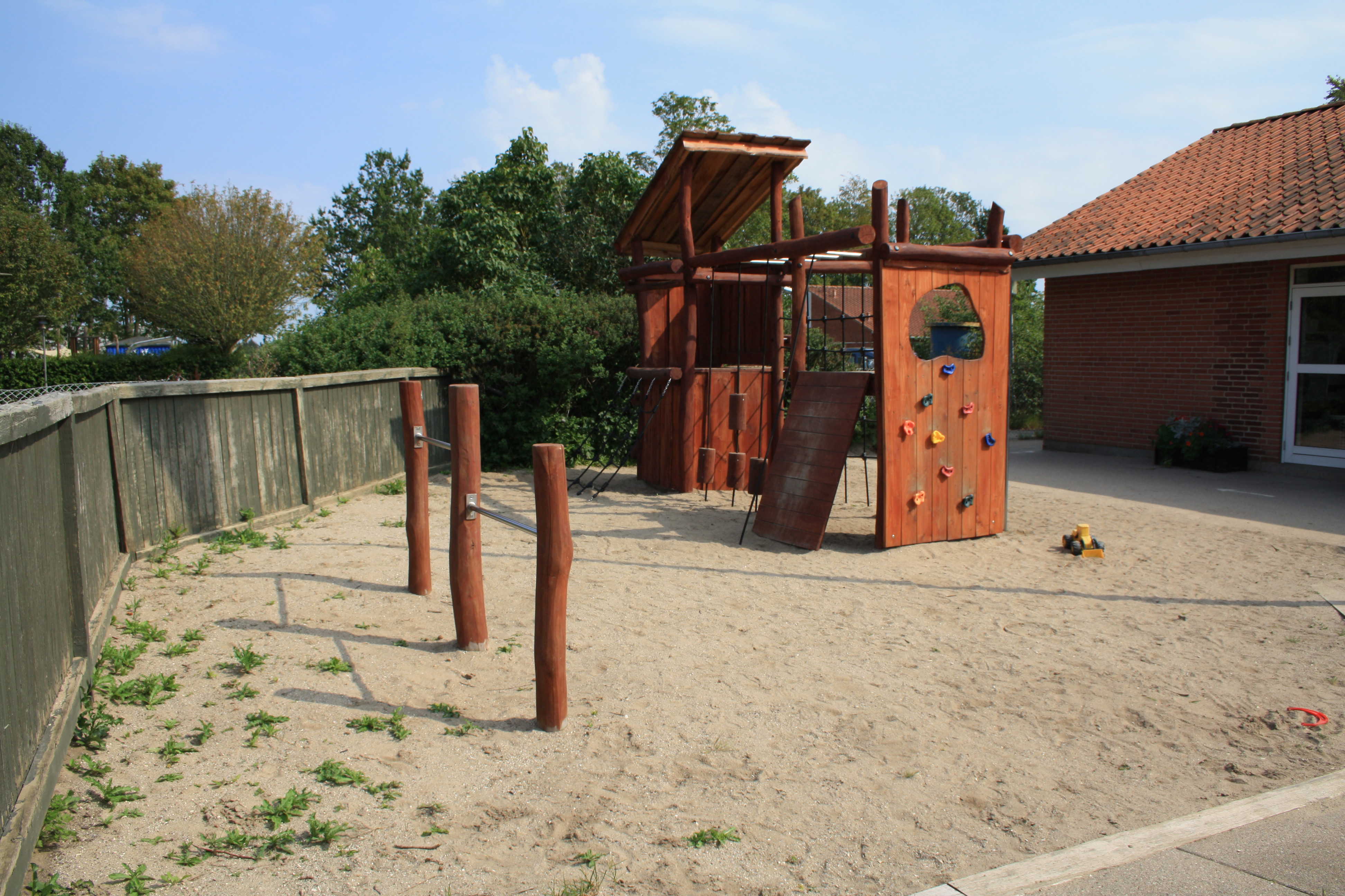 Vi har en dejlig, stor legeplads. Legepladsen er ikke opdelt, så børnene frit udfolde sig og lege på tværs af grupperne.