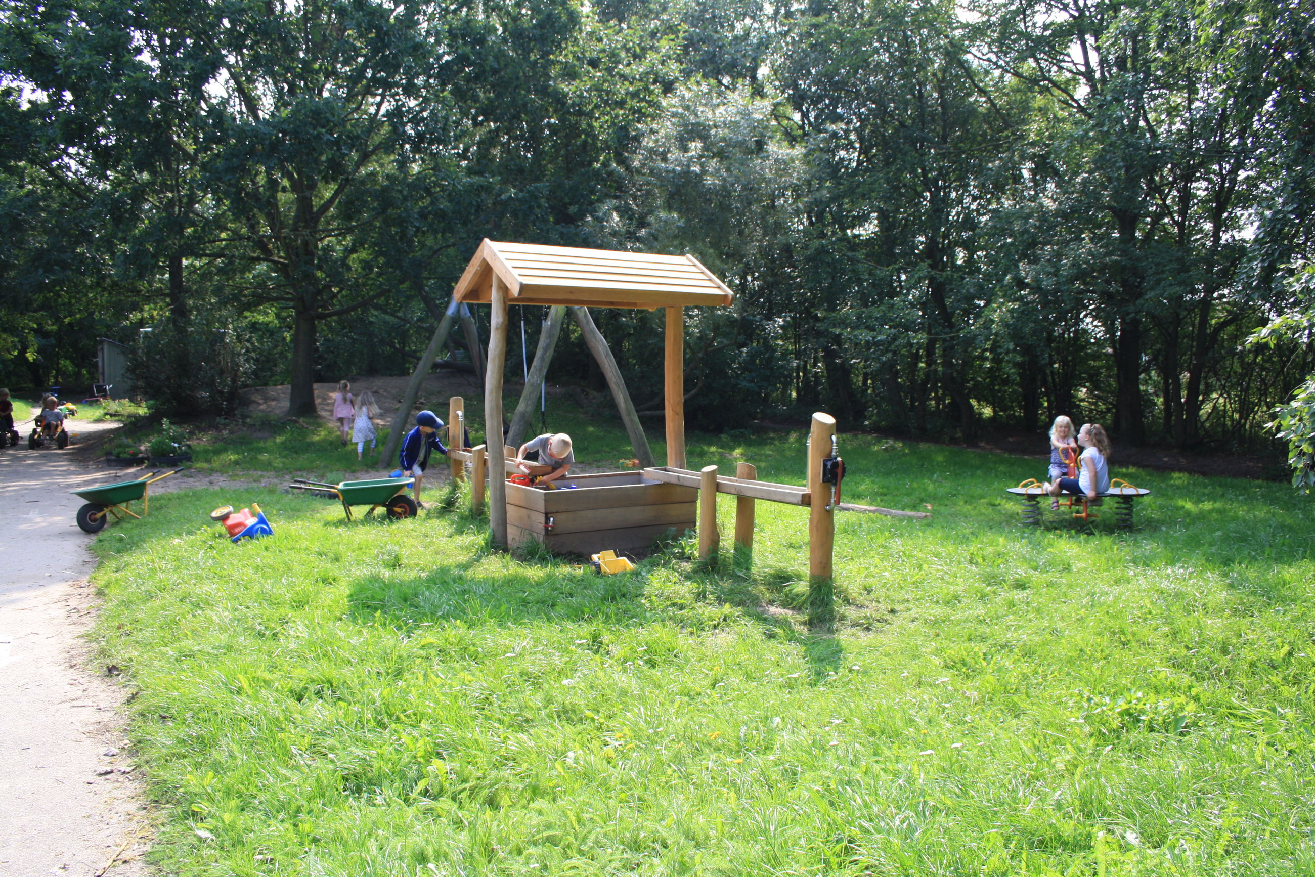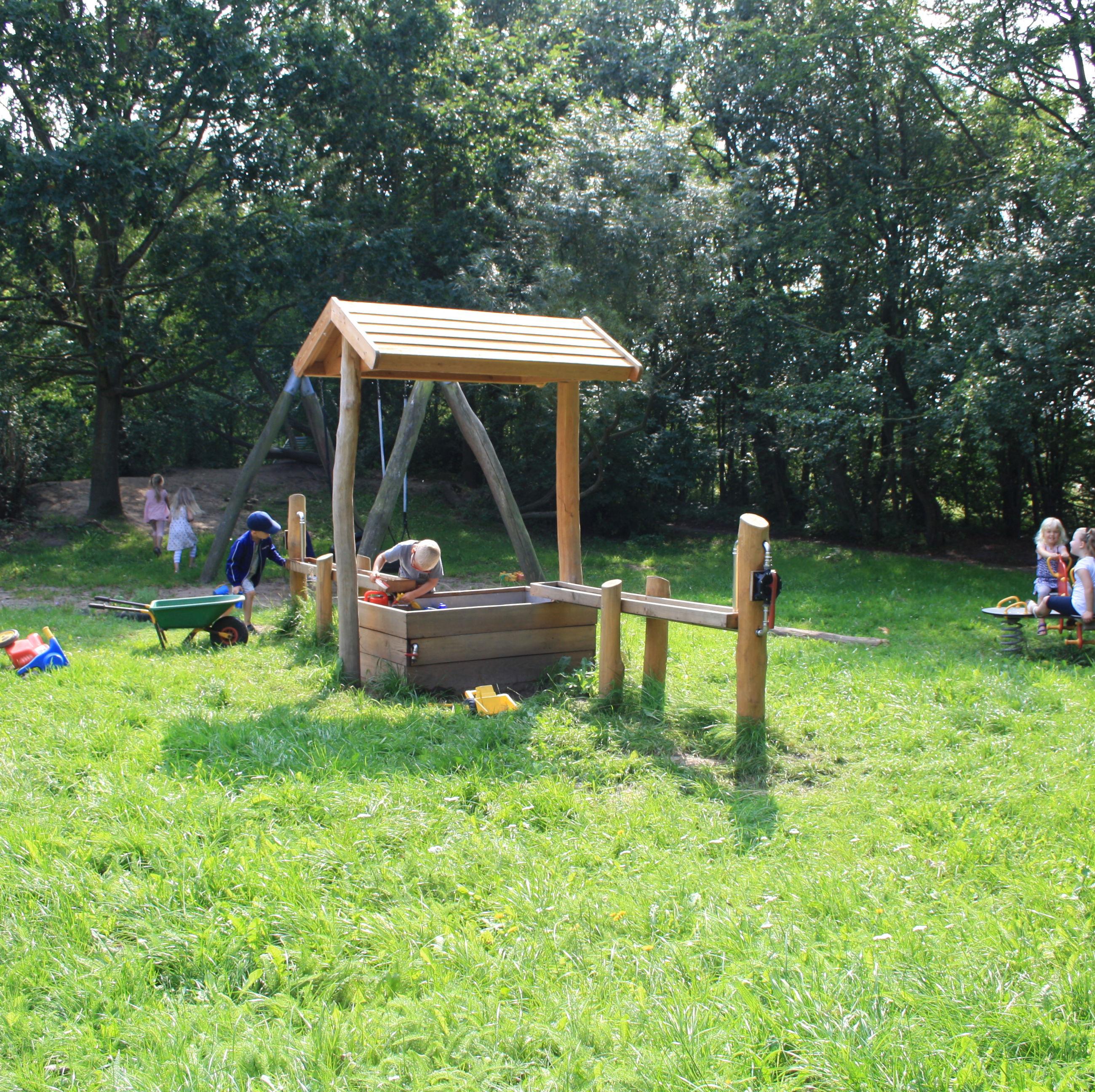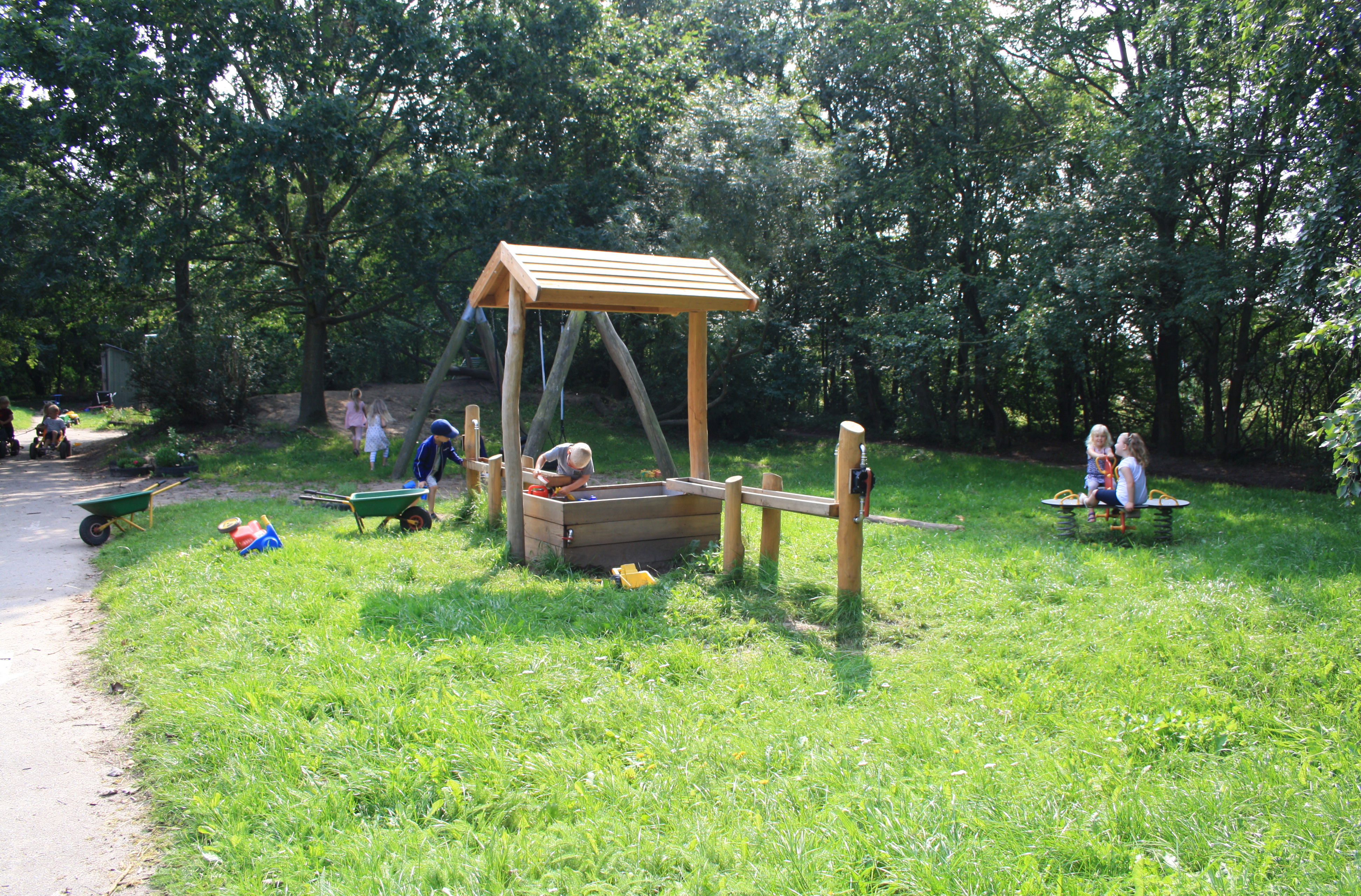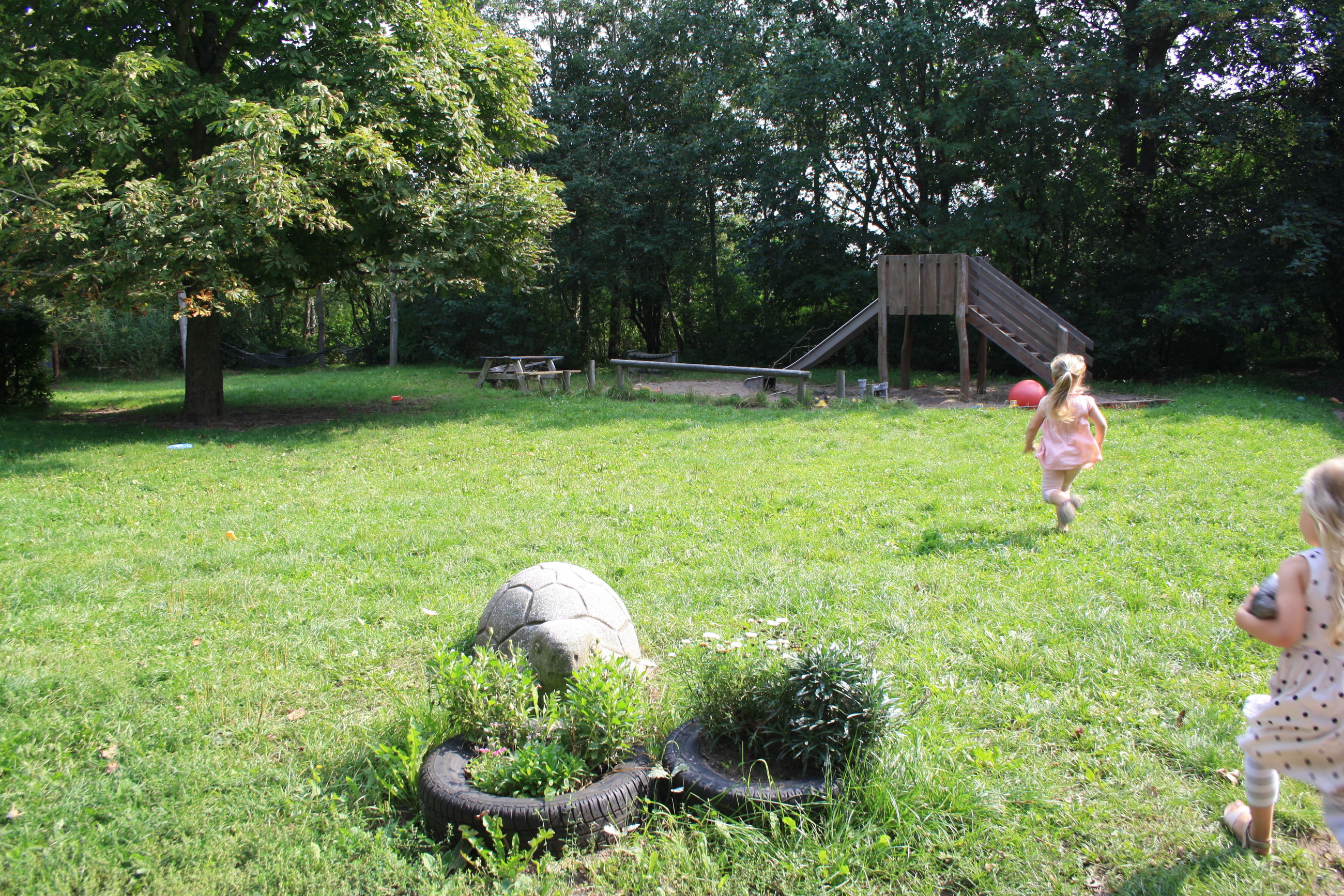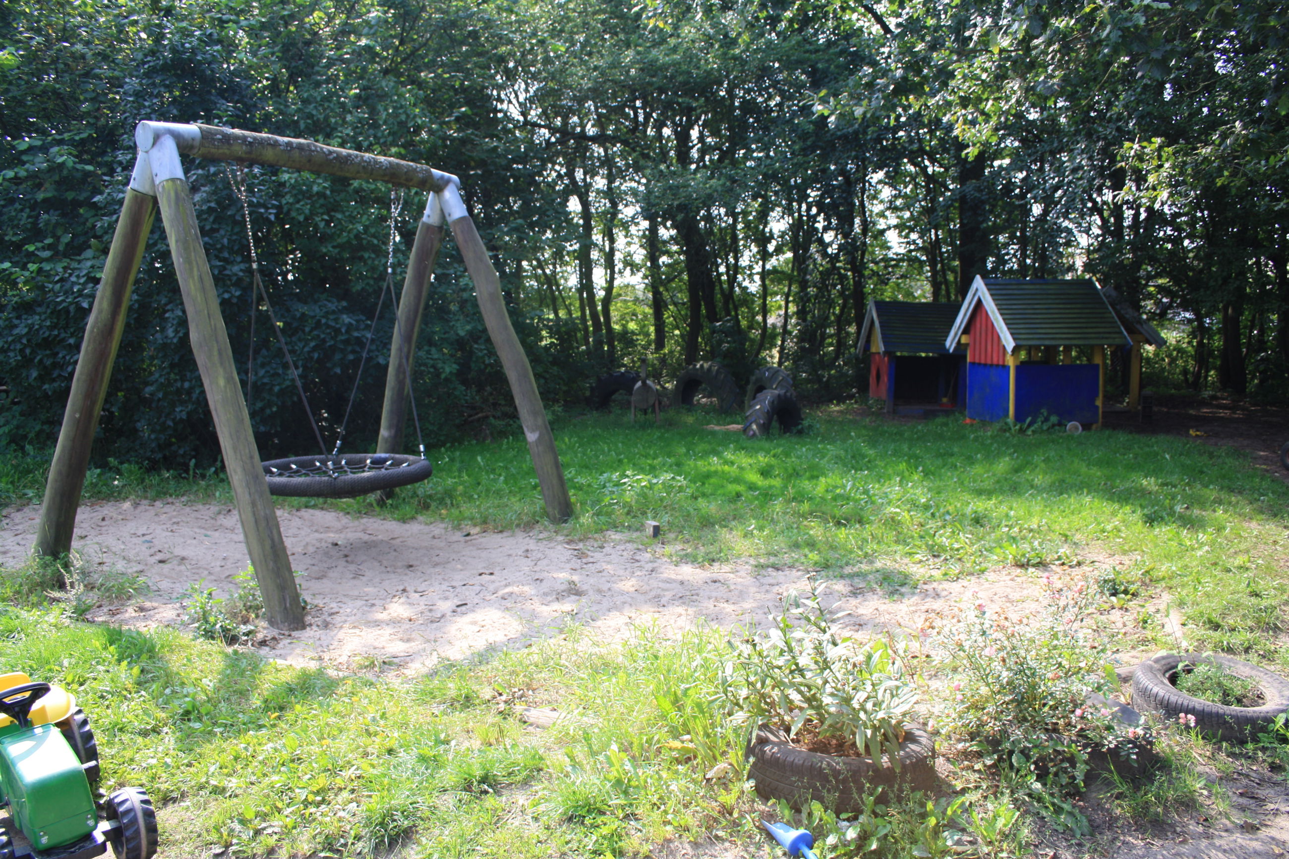 Vi har en dejlig, stor legeplads. Legepladsen er ikke opdelt, så børnene frit udfolde sig og lege på tværs af grupperne.